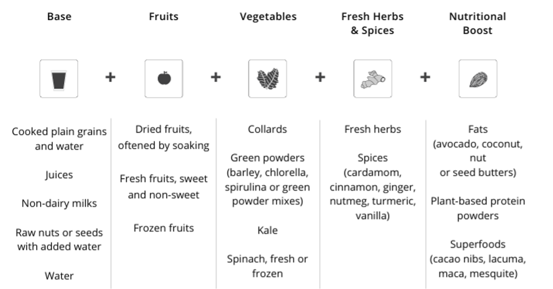 Smoothies are a delicious and nutrient-dense cleansing option when you don’t have a morning appetite or you’re in a hurry. To create a smoothie, choose one ingredient from each category in the chart below. Consider seasonality, organic, unadulterated, local ingredients, and of course, your preferences.