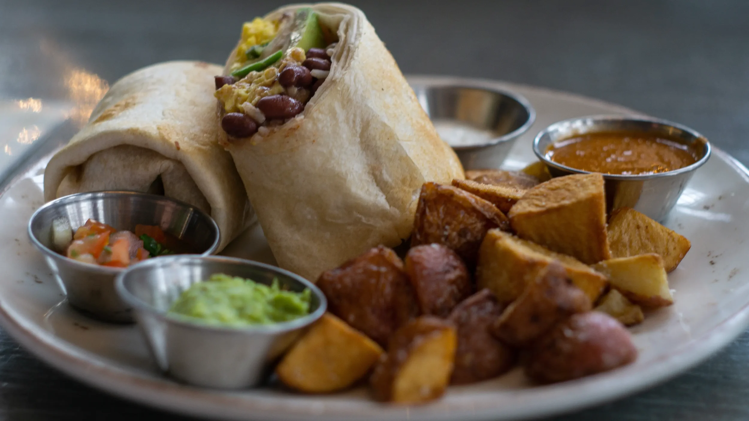 To assemble the burrito, place some of the tofu scramble onto a heated tortilla and add some of the black beans, potatoes, and sliced tomatoes.